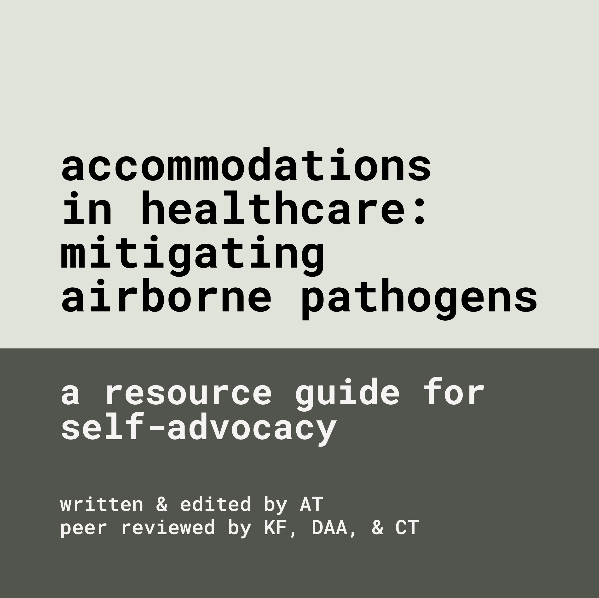 Image description: A graphic with contrasting light and dark green text and background color reads, “accommodations in healthcare: mitigating airborne pathogens / a resource guide for self-advocacy / written & edited by AT / peer reviewed by KF, DAA, & CT”